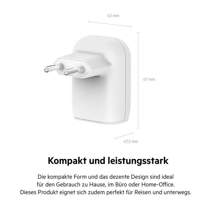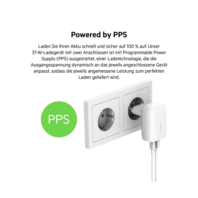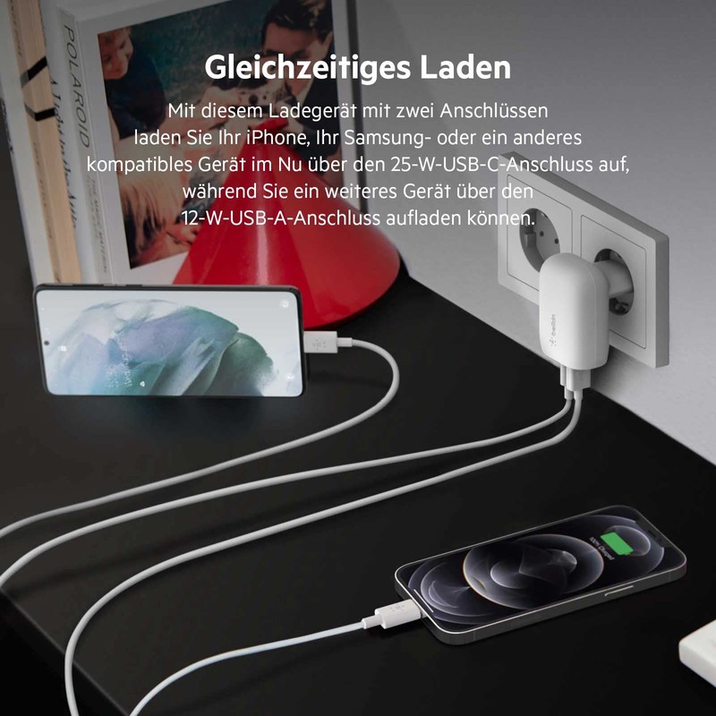 Laden Sie ein iPhone oder Ger?t von Samsung mit unserem Boost Charge Ladeger?t (37 W) mit zwei Anschl??ssen. Es verf??gt ??ber intelligente PPS-Technologie zur sicheren, optimalen Stromversorgung kompatibler Ger?te ??ber den 25-W-USB-C-Anschluss, w?hrend ein anderes Ger?t ??ber den 12-W-USB-A-Anschluss geladen werden kann. Geeignet f??r: iPhone 14, iPhone 14 Plus, iPhone 14 Pro, iPhone 14 Pro Max, iPhone 13, iPhone 12, iPad Pro, iPad Air, MagSafe drahtloses Ladeger?t, Samsung Galaxy S23, Galaxy S23+, Galaxy S22, Galaxy S22+, S21, Pixel 7, Pixel 6, Pixel 5, und mehr. * Die USB-PD-Technik erm?glicht das Laden eines iPhone 12 in nur 25 Minuten von 0 auf 50 %, wenn ein nicht enthaltenes USB-C-Kabel mit Lightning Connector verwendet wird. Ladezeiten sind abh?ngig von Umgebungsfaktoren; die tats?chlichen Resultate k?nnen unterschiedlich sein. ** Die USB-C-PD-Technik erm?glicht das Laden eines Galaxy S21 Ultra 5G in nur 26 Minuten von 0 auf 50 %, wenn ein USB-C-Kabel verwendet wird (Kabel nicht enthalten). Ladezeiten sind abh?ngig von Umgebungsfaktoren; die tats?chlichen Resultate k?nnen unterschiedlich sein.