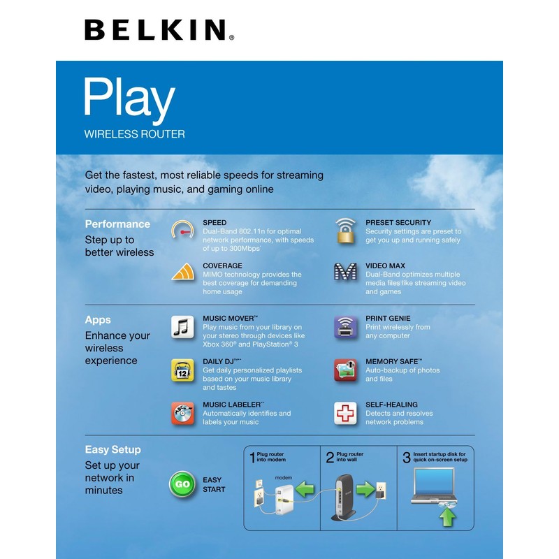 - Easy 3-step set-up; preconfigured security: Wi-Fi Protected Setup, 256-bit WPA/WPA2 and 64/128 WEP encryption