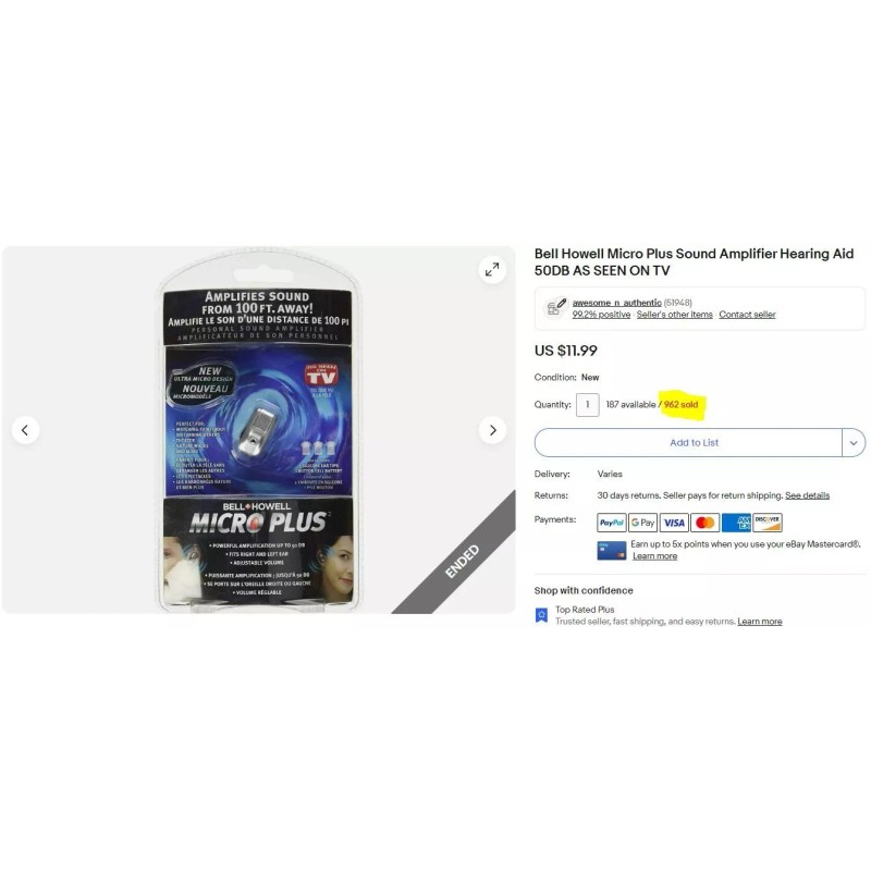 Bell and Howell BH Micro Plus Sound Amplifier Hearing Aid 50DB