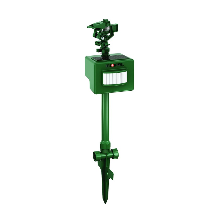 - FAST AND EFFECTIVE:The Bell & Howell Solar Powered Spray Away Motion Activated Sprinkler Animal Repeller uses motion, noise and an unexpected jet of water to deter pests and keep your property secure. When the built-in sensor detects movement within a range of 30 feet it activates a stream of water that startles and sprays the unexpected visitor into leaving. No need for cruel traps or toxic poisons that can contribute to an unsafe environment.