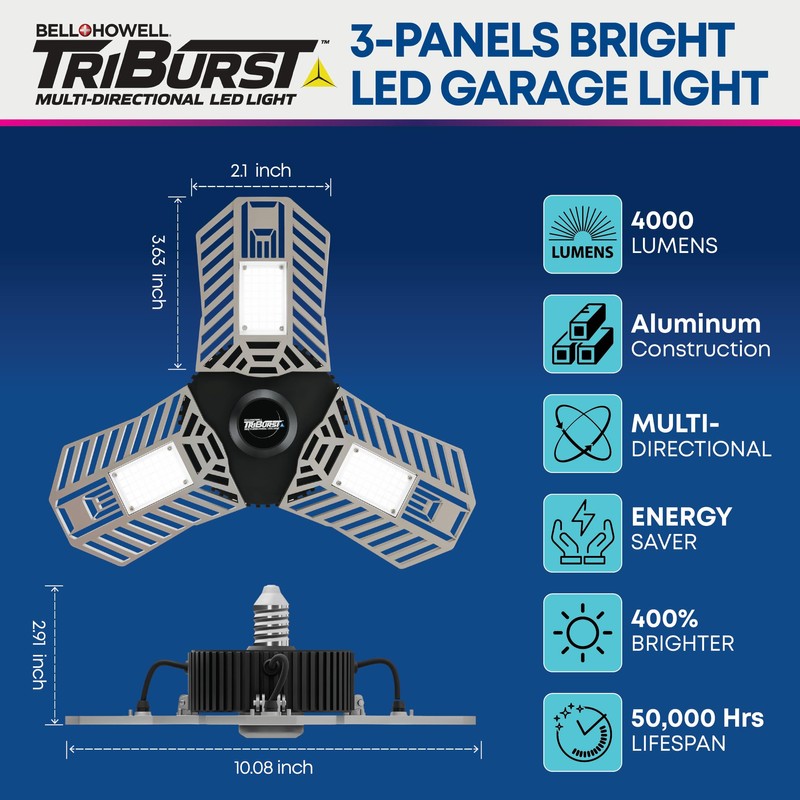 Bell+Howell TRIBURST Aluminum LED Socket Ceiling Lights 60W 4000 LM 6500 K – LED Shop Lights with 3 Deformable Panels, Ultra Bright Ceiling Light for Indoor, Bedroom, Living Room, Garage E26 / E27