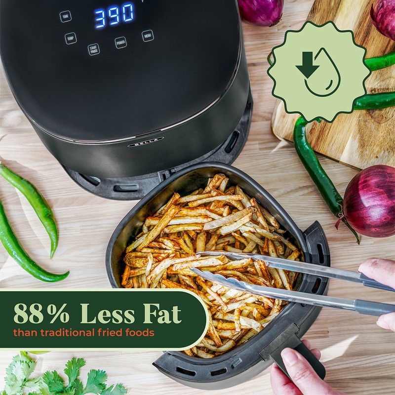 - INDULGE IN HEALTHY DELIGHTS: Enjoy guilt-free meals with 88% less fat and 65% fewer calories than typical fast food restaurants. The PFOA-free Nonstick basket and crisping tray are removable and dishwasher safe, making cleanup of the mini oven a breeze