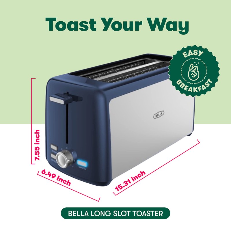 BELLA 4 Slice Toaster, Long Slot & Removable Crumb Tray, 7 Shading Options with Auto Shut Off, Cancel & Reheat Button, Toast Bread & Bagel, Stainless Steel & Blue