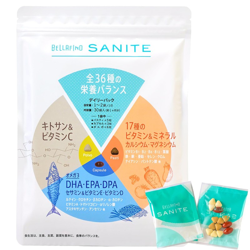 - ✅【利便性を追求したデイリーパック】必要な栄養素を摂りたくて、マルチビタミン・マルチミネラル・セサミン・オメガ3・ルテイン・アスタキサンチン・キトサン・カルシウムサプリを、それぞれ毎日飲もうと思うと大変面倒です。SANITE(サニーテ)は必要な栄養を、バランス良く1回分を1袋にまとめた、手間なく飲み忘れしにくい設計となっています。1袋の粒数は少し多いですが結果にこだわったベストな配合となっています。