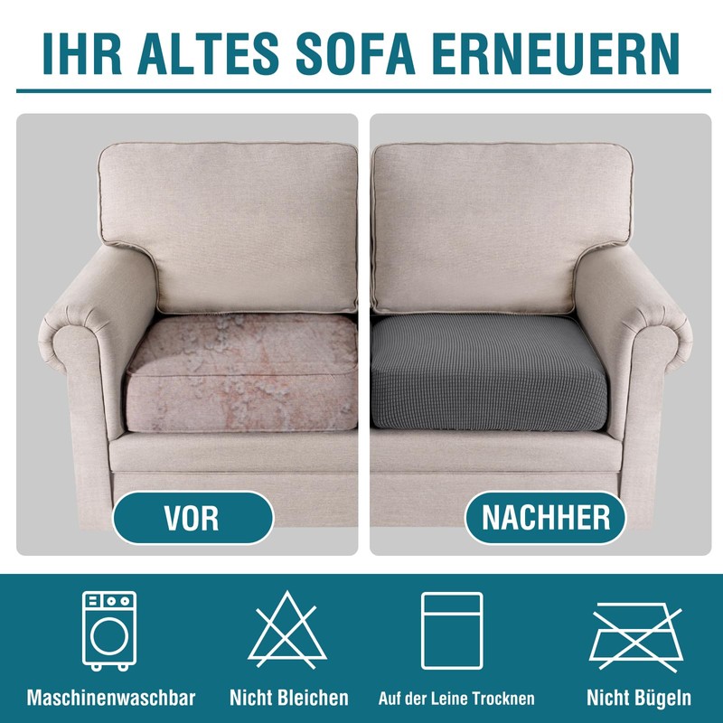 - LARGE FIT: Set of 2. This innovative sofa cushion cover is made of durable and soft, stretchy fabric. Chair seat cover (fits seating area between 58-70 cm). One size fits most, please measure before ordering. Suitable for both T-cushion and box cushion styles.