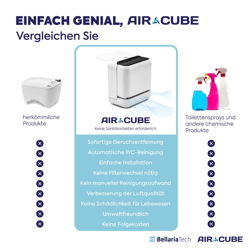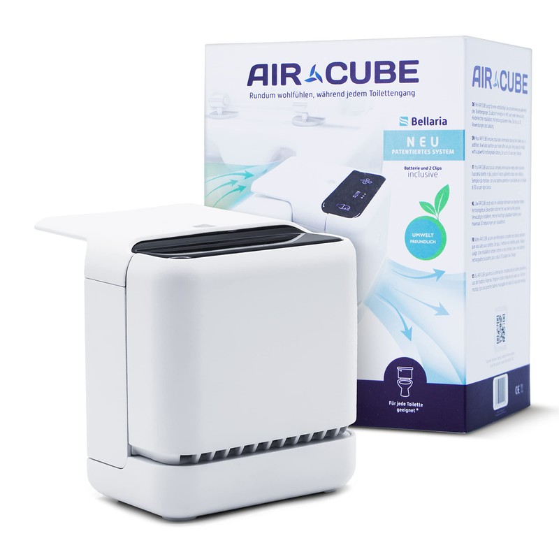 - Complete odour neutralisation: the proven ionisation technology neutralises odours and odours. Almost silently, the battery-operated Air Cube sucks the air out of the toilet and eliminates bad odours instead of just covering them. For a fresh scent in the bathroom/toilet.