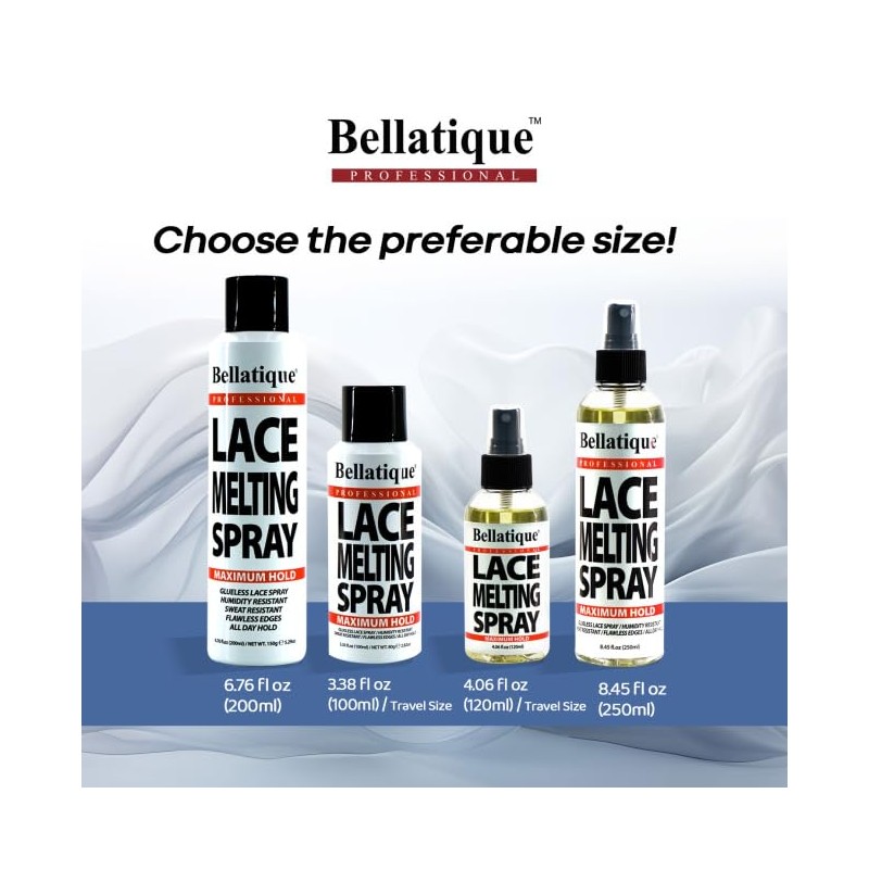 Bellatique Lace Melting Spray (6.67 oz) - Maximum Hold. Flawless Edges, Quick & Easy, Fast Drying, Humidity Resistant, Sweat Resistant, All Day Hold, Quick Drying, Flake Free, Easily Removed.