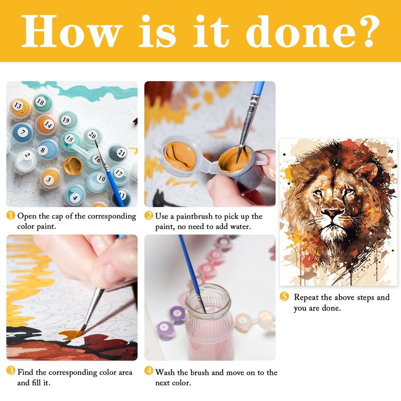 These four beautiful paint by numbers animals show the portrait beauty of the king of the jungle. We have used artistic colours to render the animals' own characteristics and make them appear more vivid and vibrant in the paintings. We use bright colours to represent the different beauty of animals with our family and friends!