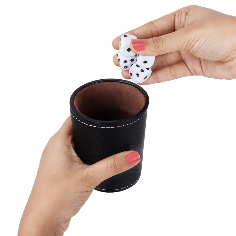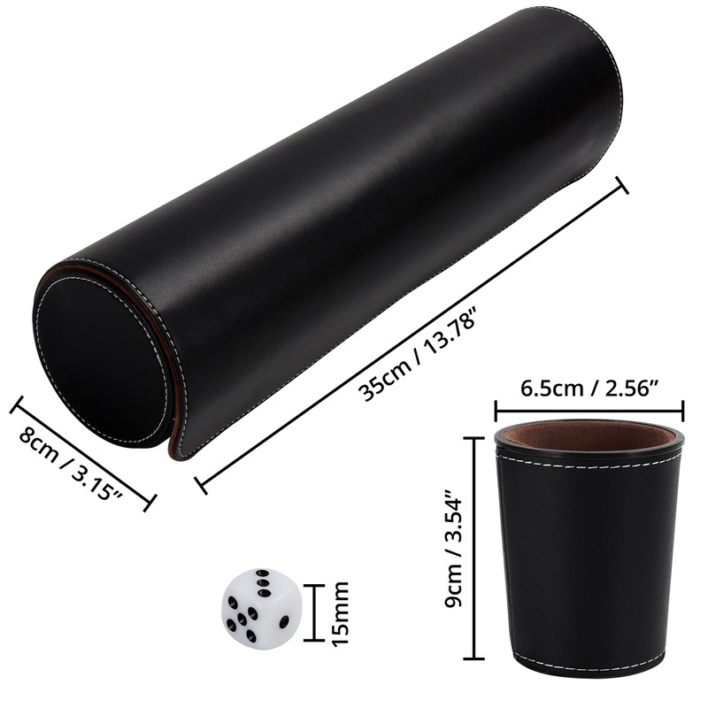 - HUGE DICE CUP SET: This huge set includes 5 PU leather dice cups, 25 6-sided white plastic dice, and a matching faux leather transport case. Each cup has a height of 9cm (3.54 inches), with an opening diameter of 6.5cm (2.56 inches). The dice are slightly smaller than normal dice, measuring 15mm in height. Our case means you can keep all of the dice and cups in one convenient, safe place without losing them. The case measures W8 x L35cm (3.15 x 13.78 inches).
