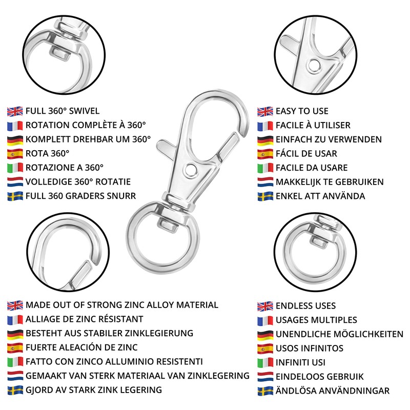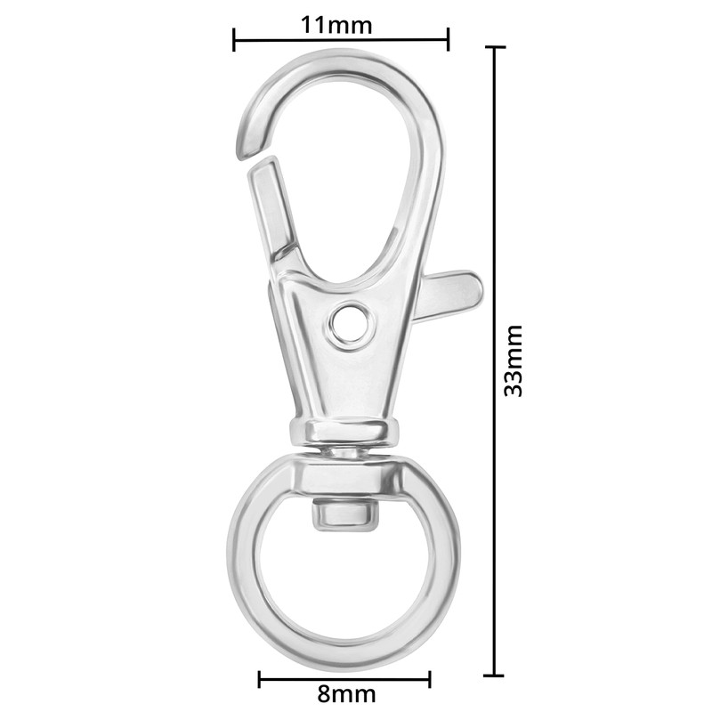 - 50 SWIVEL HOOKS: Included in this set are 50 mini silver swivel lobster clasps with 50 key rings. The swivel hooks are made out of zinc alloy and measure 33mm in length and the keyring diameter is 8mm. The clasps have a maximum weight capacity of 5 - 8kg (12 - 18lbs). They can rotate a full 360 degrees and have a snap-lock mechanism, meaning they will not accidentally open.