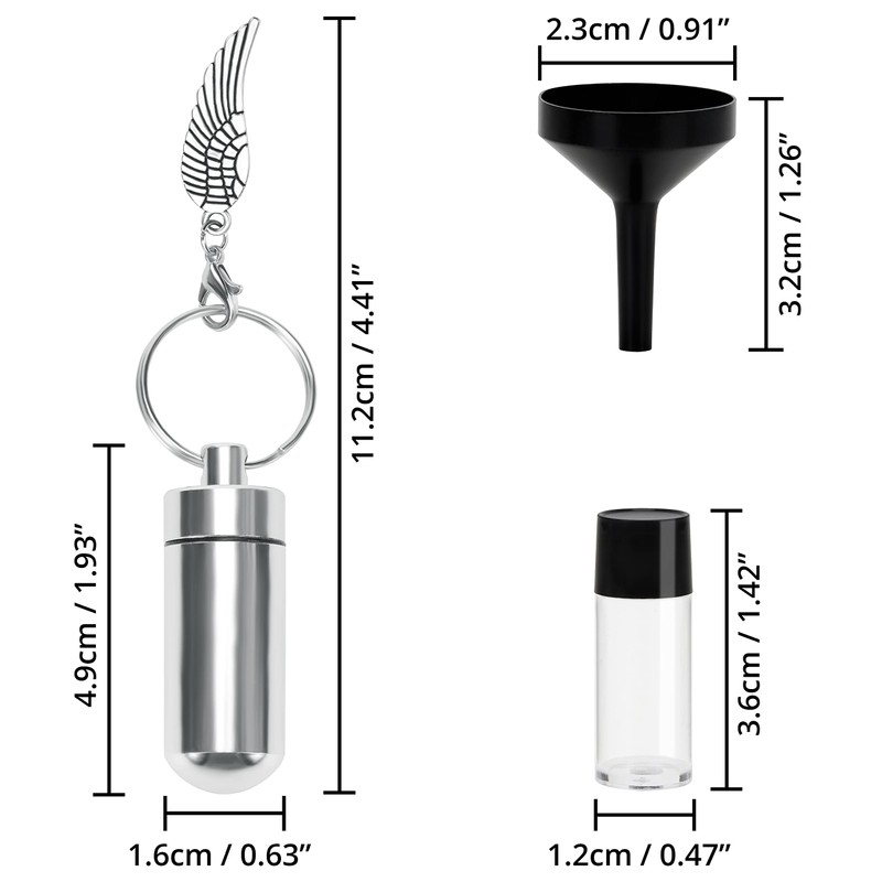 - 4 PACK OF FUNERAL PENDANTS: This set consists of 4 silver vials, each one has a keyring attached and a small angel wing charm. The pendants measure W1.6 x L4.9cm (0.63 x 1.93 inches) and weigh approximately 30g. Our set also includes a funnel, meaning you can easily place ashes or other small items inside the vials. The sturdy capsules can be used as funeral keepsakes for you and your friends/family to remember loved one's that have passed away, representing everlasting love/memories.