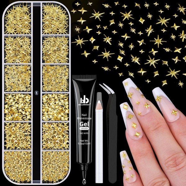 BELLEBOOST 1320Pcs 3D Star Nail Charms, Gold Metallic Nail Art Gems and Mini Round Caviar Nail Beads, Bedazzling Nail Craft Decoration Accessories with Tweezers, Pick-up Pencil and 15ml Nail Rhinestone Glue