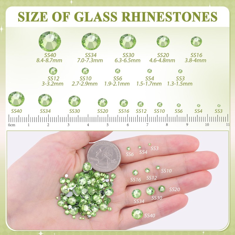 - WHAT WILL YOU GET -- The package contains about 2000 pcs SS20 (0.2") blingbling glass rhinestones (Peridot). The large amount will support you to fulfill a number of wonderful DIY decoration ideas.