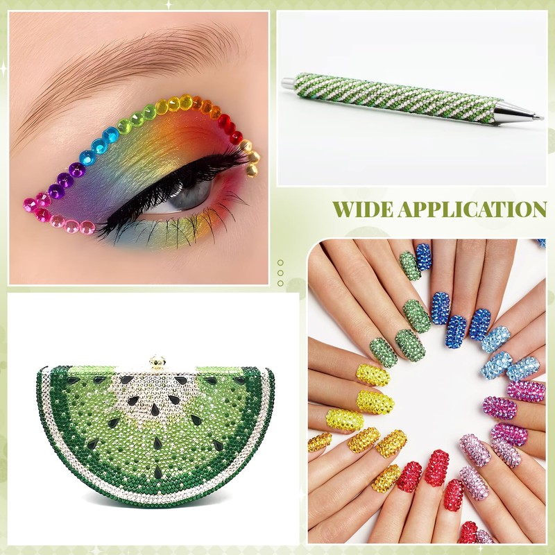 - WIDE APPLICATION -- The iridescent and bedazzling gems will remarkably add glitz to your DIY crafts, like shoes, sneakers, high heels, tumblers, mugs, goblets, bottles, clothes, dresses, jeans, hats, masks, glasses, phone cases, popsockets, scrapbooks, diamond paintings, greeting cards, bags, guitars, keychains, hair clips, etc. You can use them for face makeup, eye makeup, body art, 3D nail art as well. Apply it to whatever you want to bedazzle!