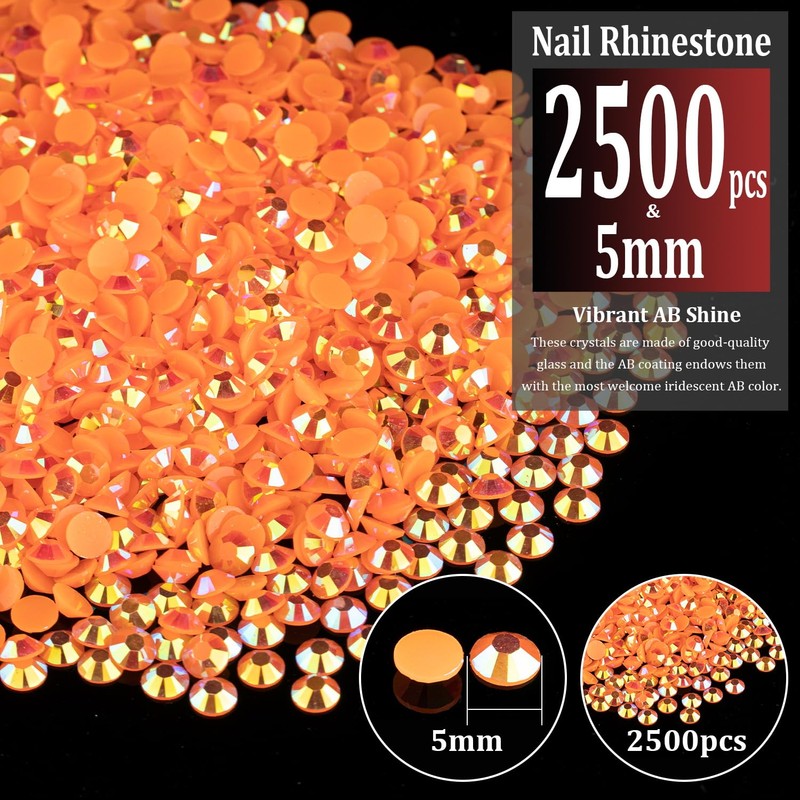 PACKAGE CONTENTContains approximately 2500 pieces of 5mm-SS20(0.2") Orange AB color bling resin rhinestones. Additionally, a tweezer and 1 pickup pencil are included for easy picking up of glitter gems.VIBRANT GEMS FOR CRAFTMade of choice resin, these rhinestones are lightweight, durable, and economical. Designed with perfect cutting facets, these high-quality jelly gems have a delicate and exquisite shine, enhancing the appeal of your crafts or nails with their vibrant colors. The AB coating is firmly combined on the outer surface of each rhinestone, which will have different color performances under different light or different refraction angles, providing long-lasting sparkle.TIPS FOR USENon-hot fix jelly flatback gemstones require adhesive for nail art, crafts, or artwork design. We recommend using B7000 rhinestone jewelry glue for DIY projects and UV / quick dry nail glue for nail art. To apply the resin rhinestones, first, clean the surface of your nails or the crafts you wish to embellish. Then, apply the rhinestones with the appropriate glue and wait for them to dry. (Please note that glue is not included.)WIDE APPLICATIONThese sparkling iridescent resin rhinestones are perfect for creating dazzling looks. Use them for face makeup, eye makeup, body art, 3D nail art or bedazzling DIY crafts like shoes, tumblers, mugs, bottles, phone cases, popsockets, scrapbooks, photo frames, diamond paintings, greeting cards, bags, glasses, guitars, keychains, hats, masks, hair clips, bracelets, wristbands, clothing, wedding dresses, and more. Apply it to what you want to bling!HIGHLIGHTSResin rhinestones are packaged by weight, with each pack containing approximately 2500 pieces. Our store also offers a variety of colors and sizes of resin rhinestones. A sufficient amount of resin gems are suitable for paving large area designs such as diamond paintings or cups.