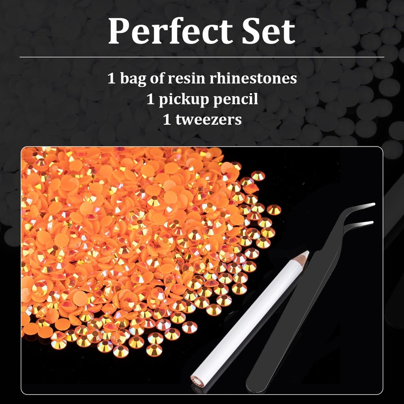 • PACKAGE CONTENT -- Contains approximately 2500 pieces of 5mm-SS20(0.2") Orange AB color bling-out resin rhinestones. Additionally, a tweezer and 1 pickup pencil are included for easy picking up of glittering gems.