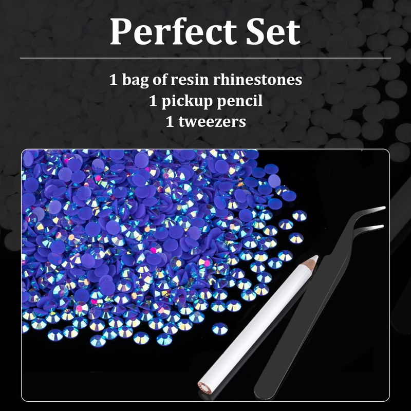 PACKAGE CONTENTContains approximately 5000 pieces of 2mm-SS6(0.08") Dark Blue AB color bling resin rhinestones. Additionally, a tweezer and 1 pickup pencil are included for easy picking up of glitter gems.VIBRANT GEMS FOR CRAFTMade of choice resin, these rhinestones are lightweight, durable, and economical. Designed with perfect cutting facets, these high-quality jelly gems have a delicate and exquisite shine, enhancing the appeal of your crafts or nails with their vibrant colors. The AB coating is firmly combined on the outer surface of each rhinestone, which will have different color performances under different light or different refraction angles, providing long-lasting sparkle.TIPS FOR USENon-hot fix jelly flatback gemstones require adhesive for nail art, crafts, or artwork design. We recommend using B7000 rhinestone jewelry glue for DIY projects and UV / quick dry nail glue for nail art. To apply the resin rhinestones, first, clean the surface of your nails or the crafts you wish to embellish. Then, apply the rhinestones with the appropriate glue and wait for them to dry. (Please note that glue is not included.)WIDE APPLICATIONThese sparkling iridescent resin rhinestones are perfect for creating dazzling looks. Use them for face makeup, eye makeup, body art, 3D nail art or bedazzling DIY crafts like shoes, tumblers, mugs, bottles, phone cases, popsockets, scrapbooks, photo frames, diamond paintings, greeting cards, bags, glasses, guitars, keychains, hats, masks, hair clips, bracelets, wristbands, clothing, wedding dresses, and more. Apply it to what you want to bling!HIGHLIGHTSResin rhinestones are packaged by weight, with each pack containing approximately 5000 pieces. Our store also offers a variety of colors and sizes of resin rhinestones. A sufficient amount of resin gems are suitable for paving large area designs such as diamond paintings or cups.