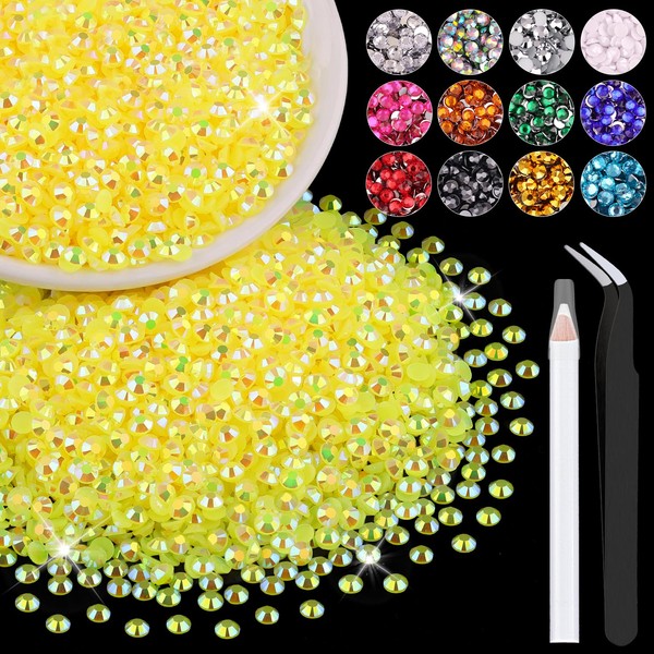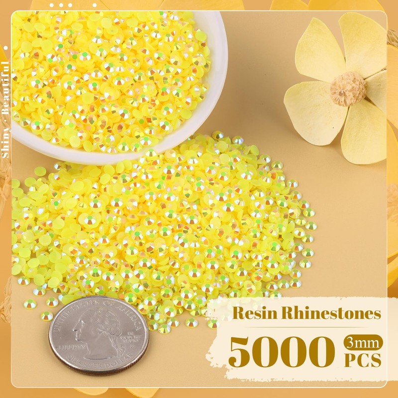 PACKAGE CONTENT -- The package contains approx. 5000 pcs of 3mm-SS12 (0.12") bling-out resin rhinestones (Lemon Yellow AB). The large amount will support you to fulfill a number of your wonderful DIY decoration ideas. Additionally, 1 tweezers and 1 pickup pen are included for easily picking up of glittering gems.TIPS FOR USE -- Non-Hot fix flatback gemstones require adhesive for crafts, nail art, or artwork design. We recommend using B7000 rhinestone jewelry glue for DIY projects and UV / quick dry nail glue for nail art. To apply the resin rhinestones, first, clean the surface of your nails or the crafts you wish to embellish. Then, apply the rhinestones with the appropriate glue and wait for them to dry. (Please note that glue is not included.)WIDE APPLICATION -- These sparkling iridescent resin rhinestones are perfect for creating dazzling looks. Use them for face makeup, eye makeup, body art, 3D nail art or bedazzling DIY crafts like shoes, tumblers, mugs, bottles, phone cases, popsockets, scrapbooks, photo frames, diamond paintings, greeting cards, bags, glasses, guitars, keychains, hats, masks, hair clips, bracelets, wristbands, clothing, wedding dresses, and more. Apply it to what you want to bling!HIGHLIGHTS -- Resin rhinestones are packaged by weight, with each pack containing approximately 5000 pcs. Our store also offers a variety of colors and sizes of resin rhinestones. A sufficient amount of resin gems are suitable for paving large area designs such as diamond paintings or cups. By choosing resin rhinestones with similar or contrasting colors, you can create color-coordinated or highly contrasting works, such as phone cases with gradient effect or colourful festival decorations.