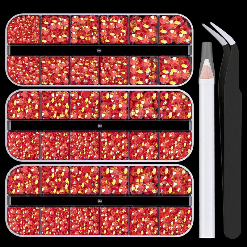 BELLEBOOST 5000PCS Resin Rhinestones with Tweezers for Crafting, 2/3/4/5/6mm Flatback Jelly Rhinestones, 3 Box Red AB Non Hotfix Crystal Gems for DIY Crafts Mugs Tumblers Clothes Makeup Nail