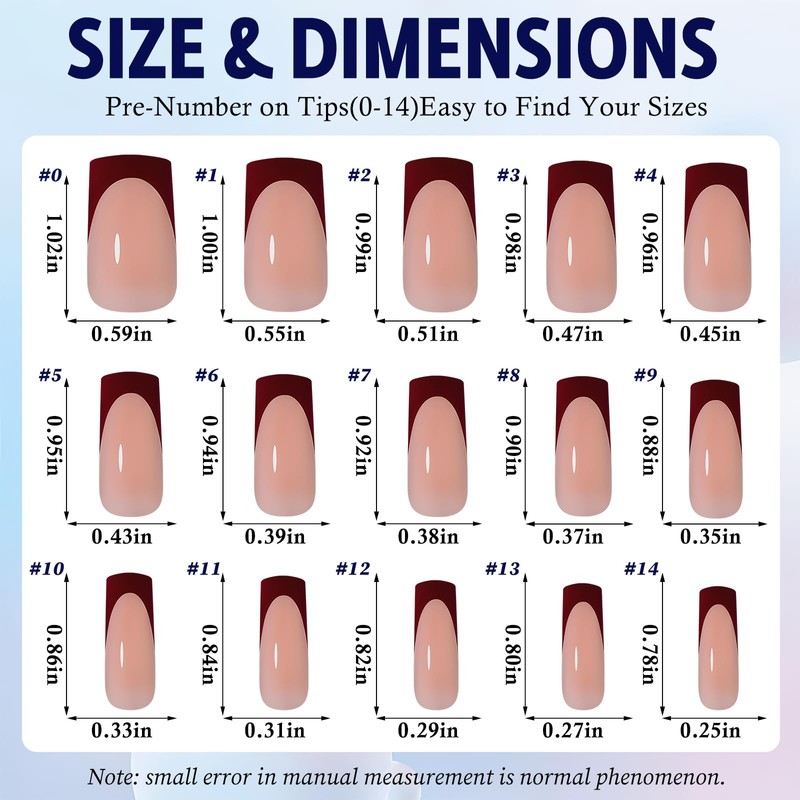 - 【Multi-size Gel Press on Nails】 Contains 15 different sizes of nail pieces, 150 pieces in total. The french fake nails provide you with more choices. The nail tips are marked with numbers "0-14". You can quickly fit the size and widely adapt to different sizes of finger requirements.