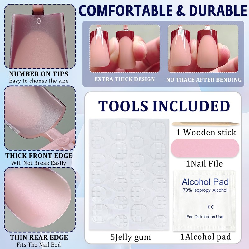 - 【Durable French Fake Nails Kit】Our nails press ons perfectly fits the nail contour from the cuticle to the free edge. These soft gel nails have a more shallow curve, the thinner back edge can make the nail tips fit your nails better, which will not make you feel uncomfortable. The thickened front edge makes it not easy to break or bend, having longer lifespan.