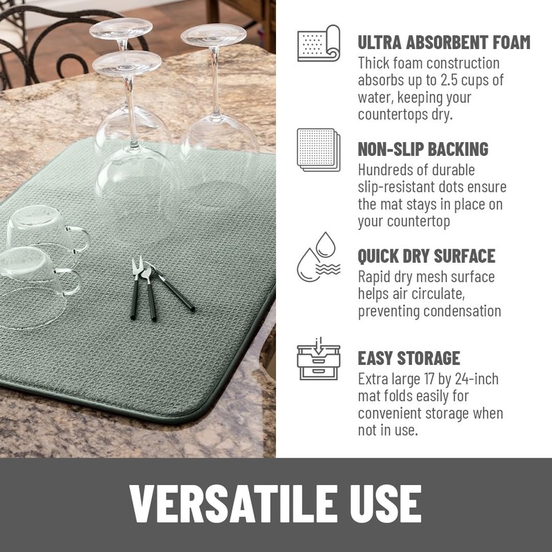Ultra absorbent microfiber keeps water that drips off your dishes from running all over the counter or onto the floor. This specially woven fabric disperses liquid rapidly from the point of contact, which not only maximizes absorption, it also helps the mat dry out faster.