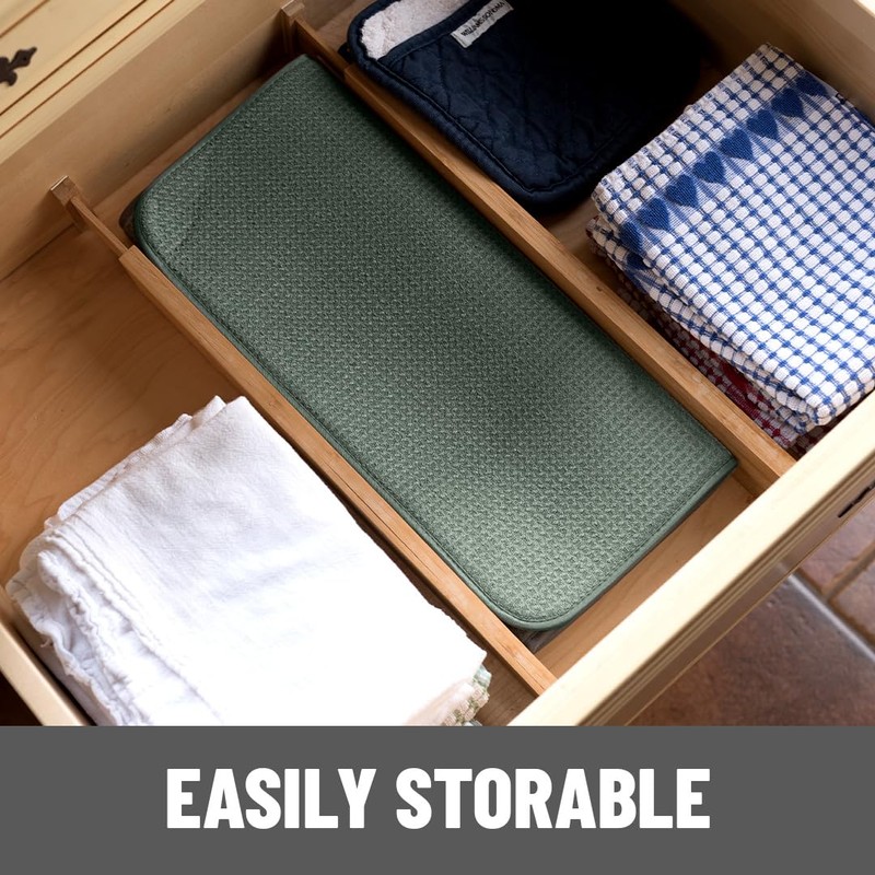 - QUICK-DRY HANG TAG | EASY STORAGE: Our manufacturing process creates naturally strong and durable dish-drying mats. Fold up and toss in a drawer or tuck it elsewhere when not in use, and simply hang with the reinforced tag to dry. Our flexible core, folded between high-tech layers of microfiber, can go anywhere!