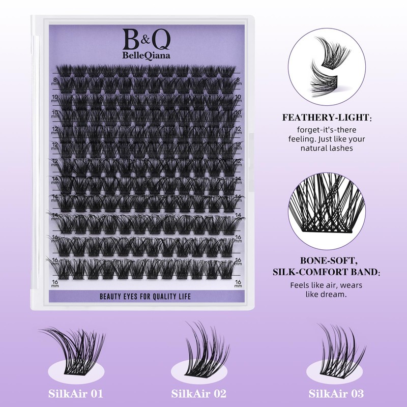 BelleQiana Silk Air Individual EyelashesFeather-Light Ultra-Soft Band Lashes, DIY Cluster Lashes 144 Pcs 0.05mm eyelashes individual at Home(Silk Air 01)