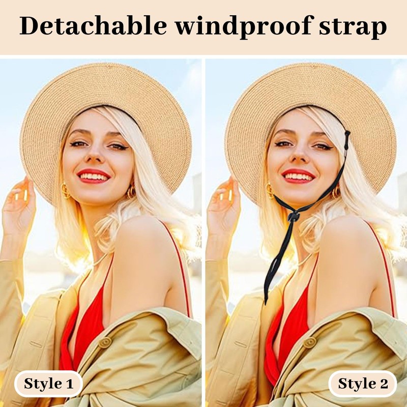2.One size fits most women: Head circumference: 58–60 cm, Brim circumference: 9 cm, Width: 10 cm. The size can be adjusted using the inner adjustment band. The straw hat with chin strap offers extra security on windy days