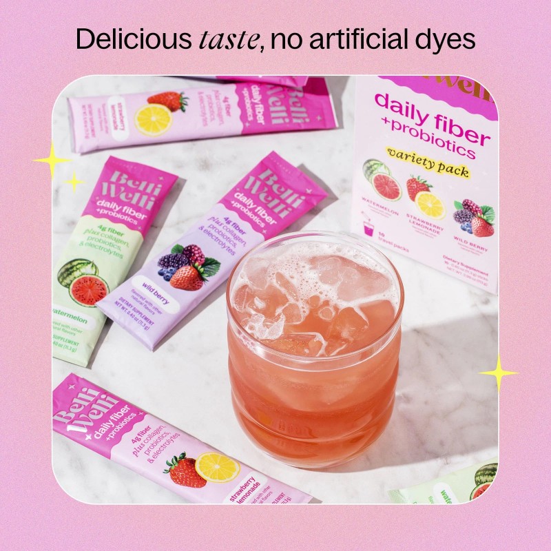 Belli Welli Daily Fiber Supplement Packets with Collagen, Probiotics & Electrolytes | Single Serve Packets for Gut Health, Digestion & Debloating | Wild Berry | 10 Count