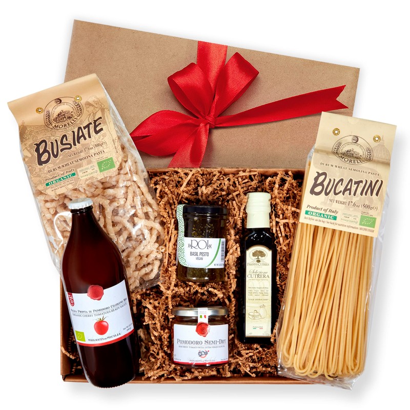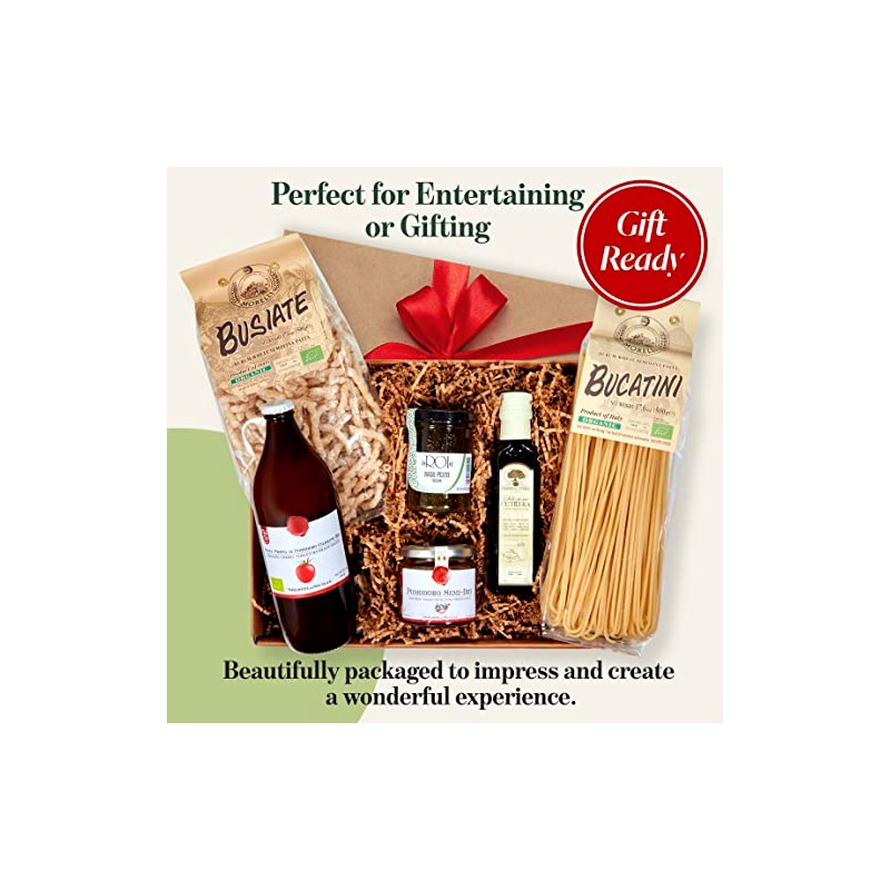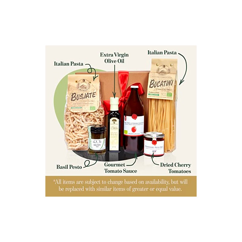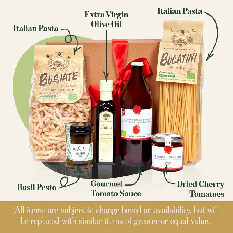 - GOURMET GIFT BASKET - Six authentic Italian food products in one amazing vegan gift set. ROI Basil Pesto, Frantoi Cutrera Cherry Tomato Sauce With Basil, Frantoi Cutrera Extra Virgin Olive Oil, Frantoi Cutrera Dried Cherry Tomatoes, and two kinds of Morelli Organic Italian Pasta are all included.