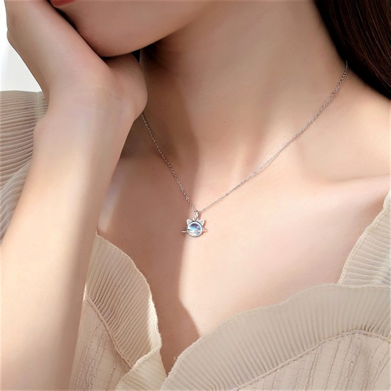 Bellitia Jewelry Moonstone Cosmic Cat Necklace Platinum Plated 925 Sterling Silver Animal Cat Chain Moonstone Pendant Necklace Jewellery Gifts for Women Girls, Sterling Silver, Moonstone