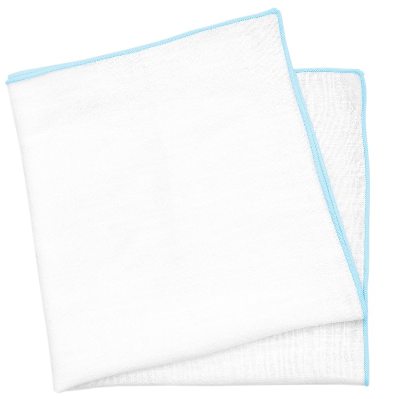 - White pocket square with pastel blue trim