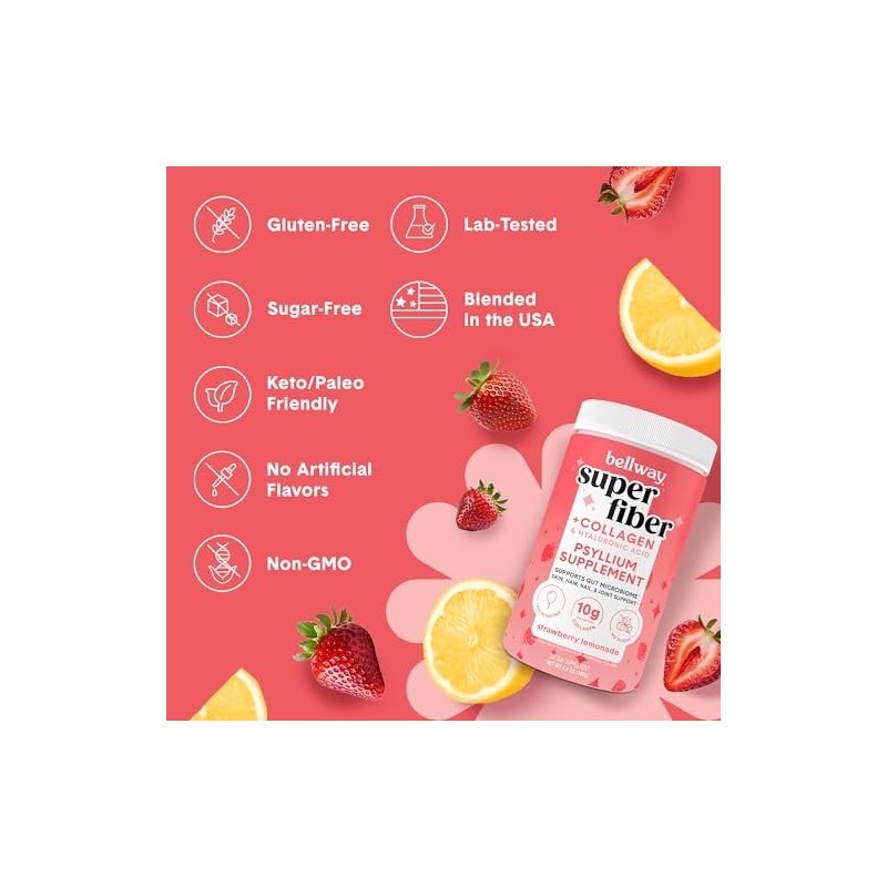 - Blended in the USA: Bellway Super Fiber + Collagen combines natural psyllium husk fiber, hydrolyzed collagen type 1 and 3, and hyaluronic acid for a wholesome supplement. In addition to being non-GMO, it’s gluten-free, sugar-free, aspartame-free, lab-tested, keto friendly & free of artificial ingredients.
