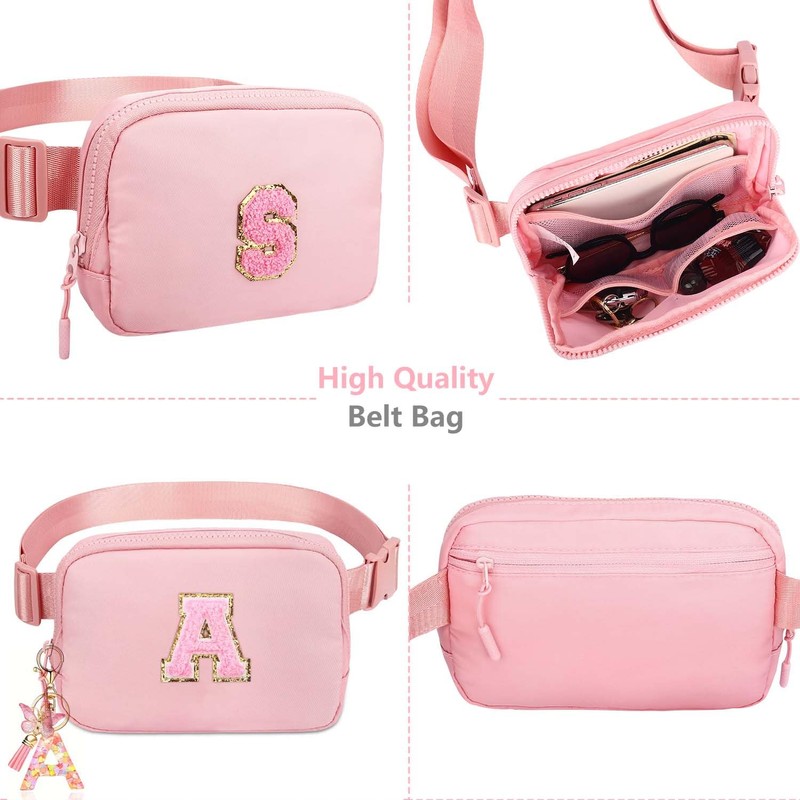 - INITIALPORTABLE SIZE-This crossbody belt bag measures 21 cm x 5 cm x 12.95 cm (8.26 inches x 1.9 inches x 5.1 inches) Cute fanny pack and travel sling bag, portable small travel essentials stuff essentials organization storage bag. LETTER PATCH FANNY PACKS FOR GIRLS-The personalized fanny pack features a monogram stitched in a cotton towel embroidery process that, unlike glett material, not only won't snag and fall off, but is also comfortable to the touch.
