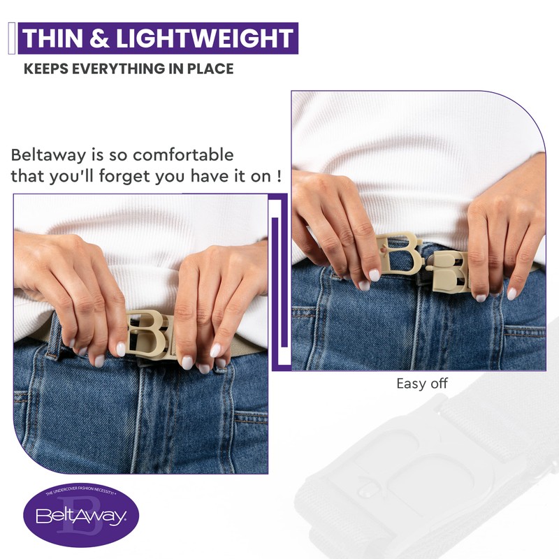 - Beltaway has just enough "give" to be comfortable while preventing that "gap" in your waistband when you sit down.