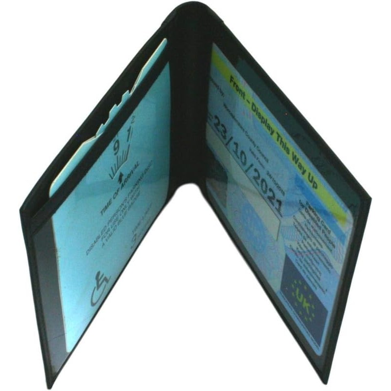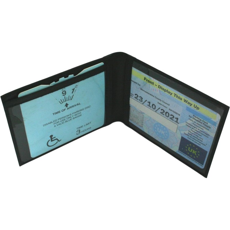 This Disabled Badge and Timer Holder is designed to hold your Blue Badge and Timer and features one of our handmade pewter / enamel badges on the front (as pictured). There is no 'Disabled' Sign or symbol anywhere on the cover to protect your privacy. The holder is made from durable black Leather also giving it a smart and sleek finish while fully protecting your blue badge and timer clock. The Holder has two PVC sleeves so that you easily can fit your blue badge and timer cards inside. The Blue badge sleeve measures 120mm X 140mm and the timer sleeve measures 110mm X 140mm. The outside dimensions of the holder are 170mm X 135mm when it is closed. The leather is stitched all the way around and has a thick strip around the spine to protect it from wearing. The words 'Real leather' are embossed on the back.