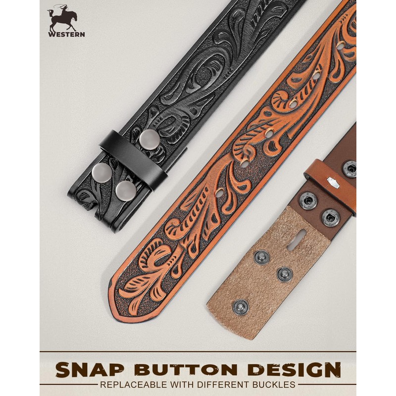 - Snap on Western Belts Leather: Western belt leather belts without buckles fit through regular 1.5" wide belt loops on jeans. Snap system for interchanging buckles making it for cowboy cowgirl everyday use and adds the perfect touch to any pair of jeans, pants.