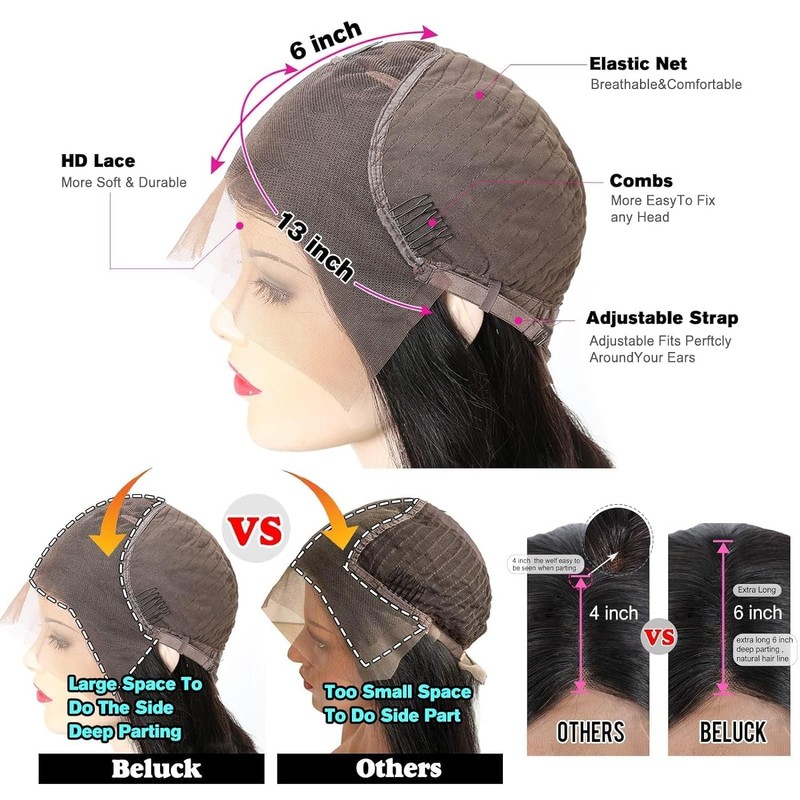 - Human Hair Wig Material: Beluck 13x6 HD Lace Front Wigs Human Hair is 100% Real Virgin Unprocessed Brazilian Human Hair, Cut From Young Donors, Healthy& Clean, Silky&Soft, Minimum Shedding and Tangle Free. Can Be Dyed, Bleached, Curled and Restyled As You Like.