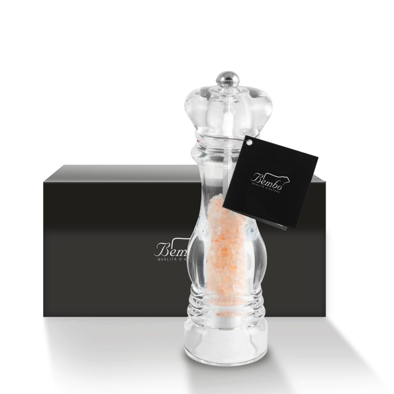 - FEATURES AND STRUCTURE: The salt mill is 21 cm high; it has a transparent thermosetting polymer structure (commonly used for dental purposes). It consists of 2 parts: the body and the head, which are connected by a device for direct connection to the adjustable ceramic grinder. Bembo salt mill is very durable: scratch-resistant, antioxidant, transparent, elegant, it does not require special care.