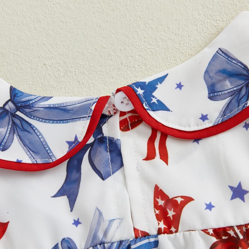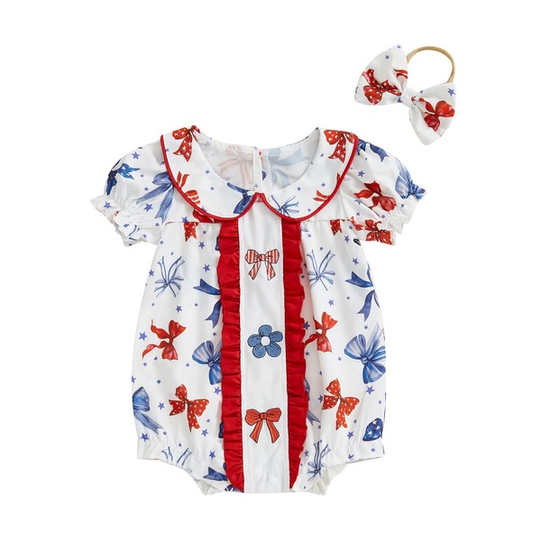 BemeyourBBs Baby Girl Bubble Romper Short Sleeve Peter Pan Collar Jumpsuit with Bow Headband Newborn Infant Summer Clothes (American flag Bow Red, 6-12 Months)