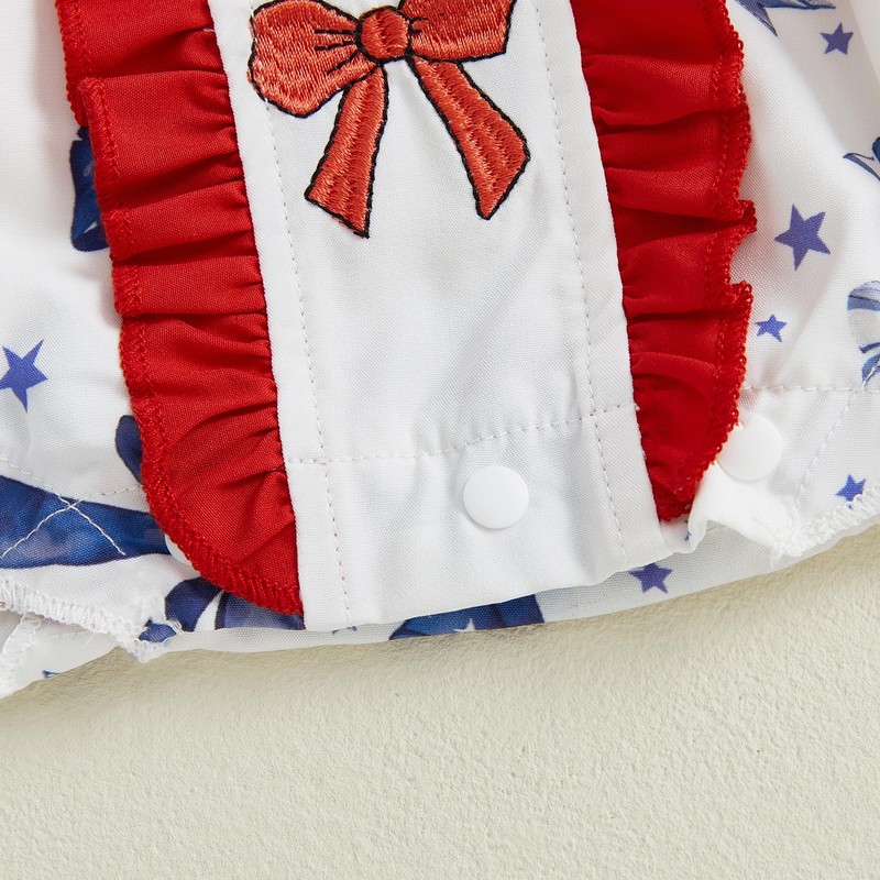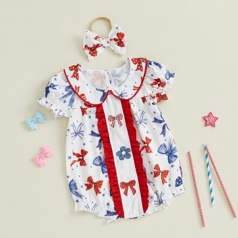 Newborn Girl Outfit, Short Sleeve Bow Flower Print Bodysuit with Bowknot Headband 4th of July Clothing