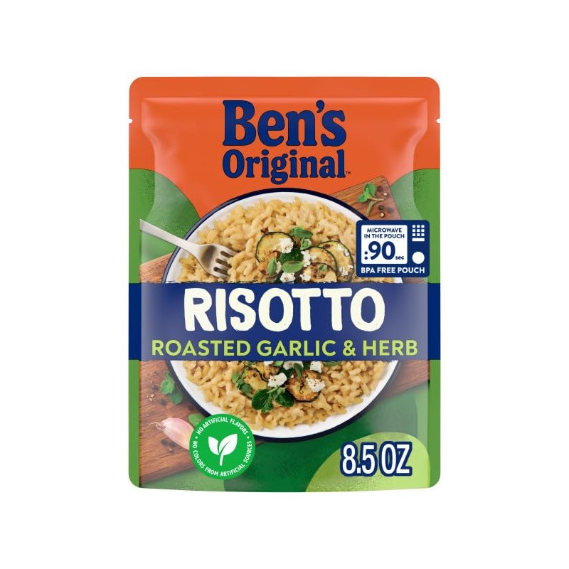 - Twelve 8.5 oz pouches of BEN'S ORIGINAL Risotto Roasted Garlic & Herb Flavored Rice
