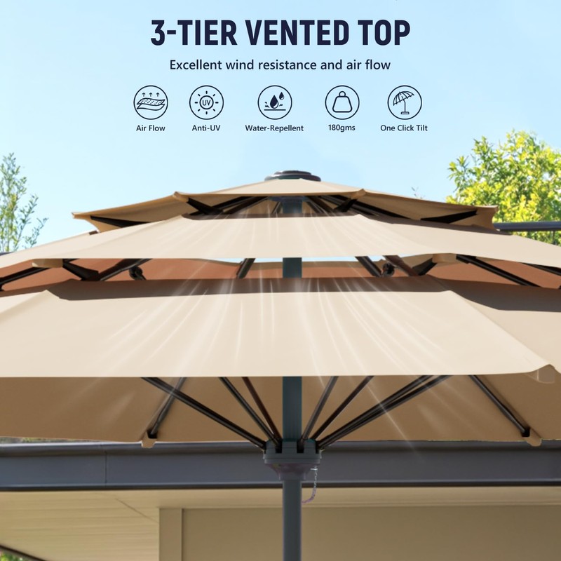 Benass 9ft Outdoor Patio Umbrella, 3 Tier Vented Table Umbrella with Push Button Tilt and Crank, 8 Fiberglass Ribs Market Umbrella (Beige)