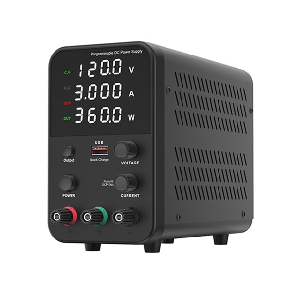 Bench DC Power Supply Variable 120V 3A Digital Display Adjustable Switching Regulated Power Supply CV CC with Output Switch, USB Quick Charge Port, Short Circuit Alarm, Encoder Adjustment Knob