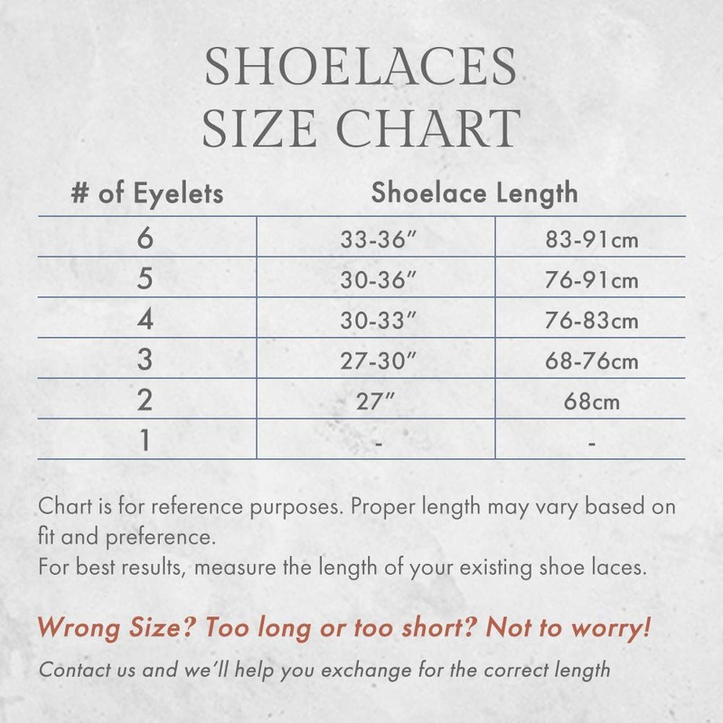 - VERSATILE LENGTHS AND COLORS: Available in 30”, 33” & 36” lengths that fit shoes from 3 to 6 eyelets. For best results, measure your existing shoe laces or refer to the size guide graphic for more details. 7 rich colors to complement your favorite shoes: navy blue, black, dark brown, slate gray, walnut, tan & charcoal gray.