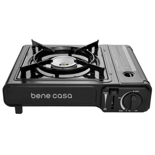 Bene Casa Portable Butane Burner 7,650 BTU | Safe & Efficient Cooking with Wind Guard & Safety Lock | Includes Portable Carrying Case