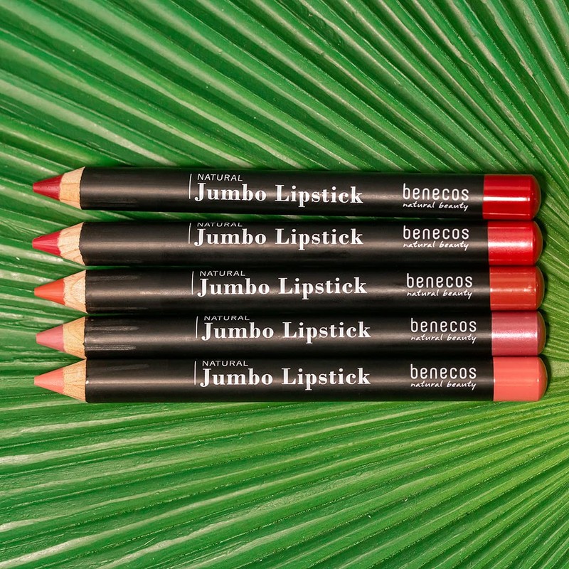 - The soft benecos Natural Jumbo Lipstick in five intense colours is completely plastic-free: the pen is made of wood, the cap is made of aluminium. The 100% natural formula with vegetable organic oils and waxes as well as cell-protecting vitamin E gives you a mega lip feeling. Moisturising organic coconut oil nourishes it delicately and supple, while organic carnauba wax provides a pleasant consistency and a gentle shine. Whether in the office, at the next party or for the upcoming short trip – in the future only you and your Jumbo lipstick! With warm sunset you get a powdery/gentle shine.