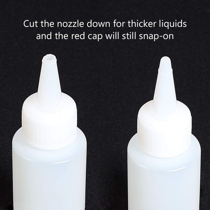 - 【Red Caps】: The Squeeze Dispensing Bottles with red snap-on tip caps and screw on tops feature a large wide mouth opening of 0.7 inch making it easy to fill with any liquids. The nozzle can be cut/trimmed down to create a larger opening for thicker liquids and the cap will still snap on