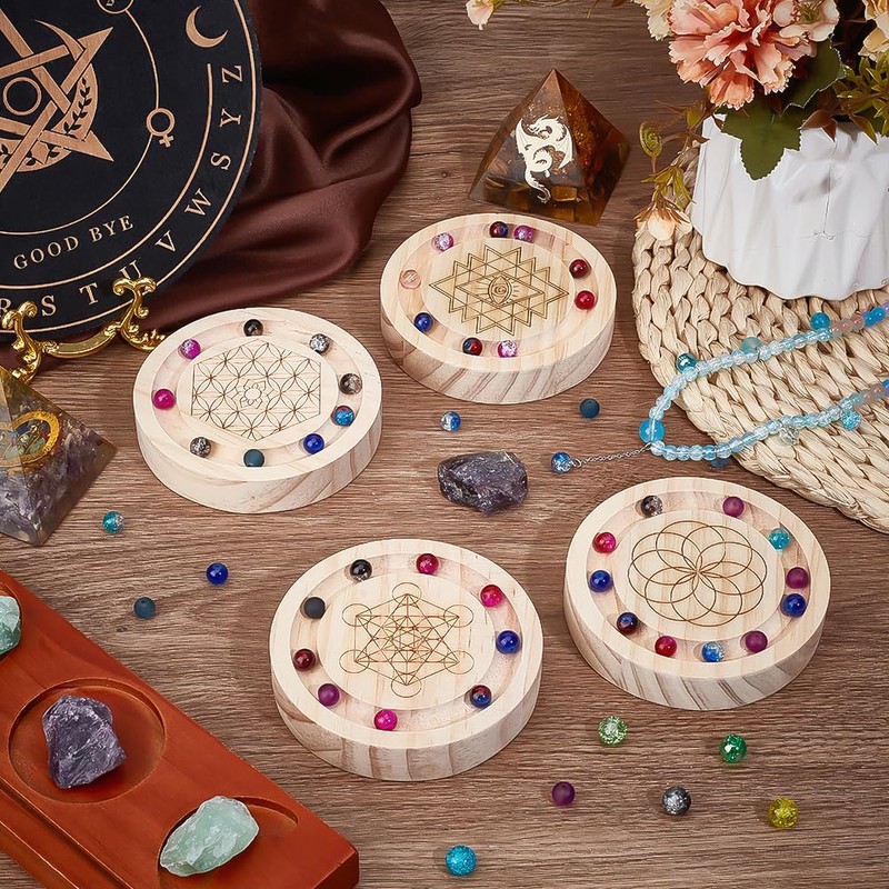 BENECREAT 4 Styles Wood Round Bead Design Board, Bracelet Bead Board with Chakra Pattern Tray for Art Crafts Jewelry Making Supplies, Slot: 10mm